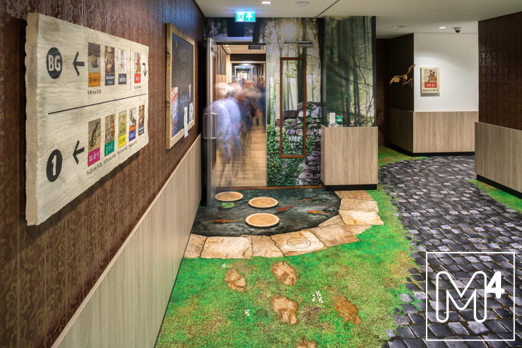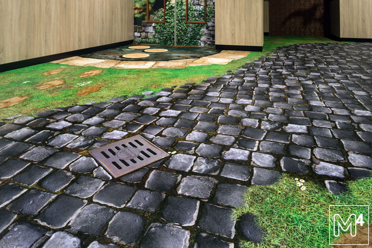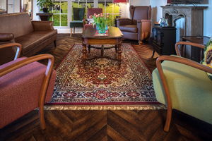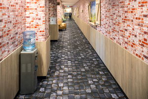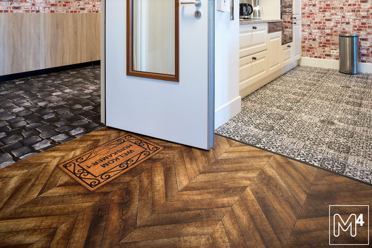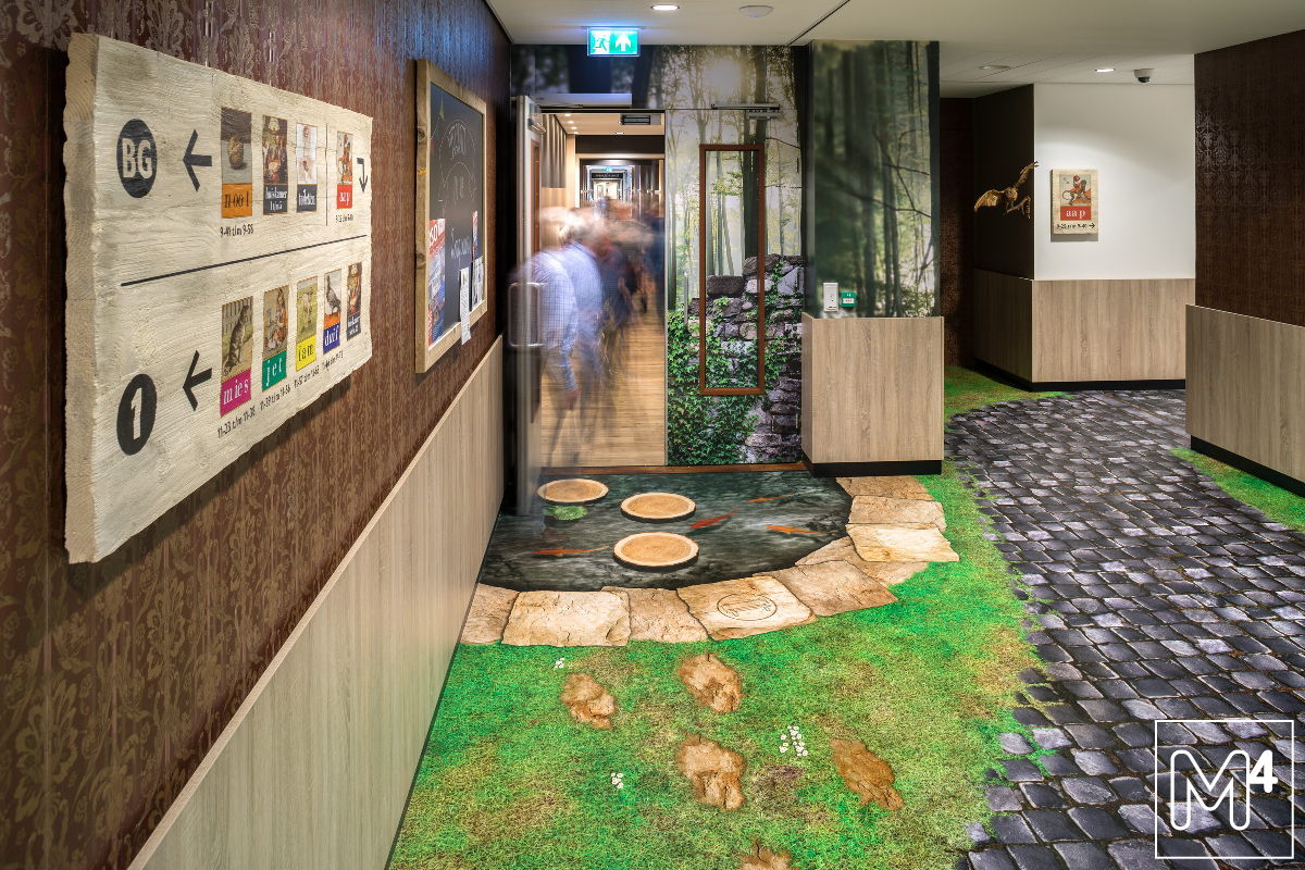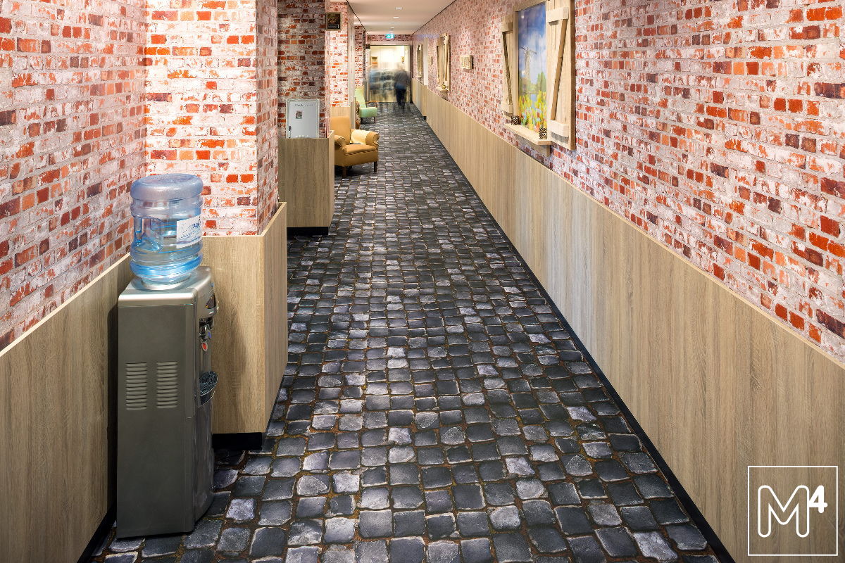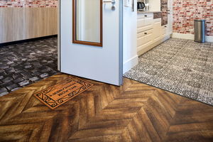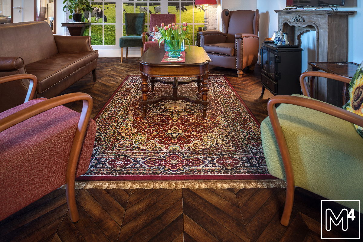 Er is onder meer gebruikt gemaakt van "paden" om een bepaalde routing te volgen en door middel van vloervisuals zijn er stopfuncties gecreerd. De perzische kleden zijn meegeprint in de houtlook en zorgen voor het behaagelijke gevoel zonder dat men er over kan struikelen. Tevens is het gemakkelijk schoon te houden. Gebruikte vloer: M4FOUR PRO
