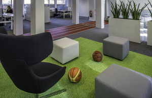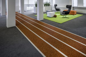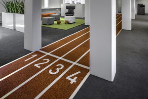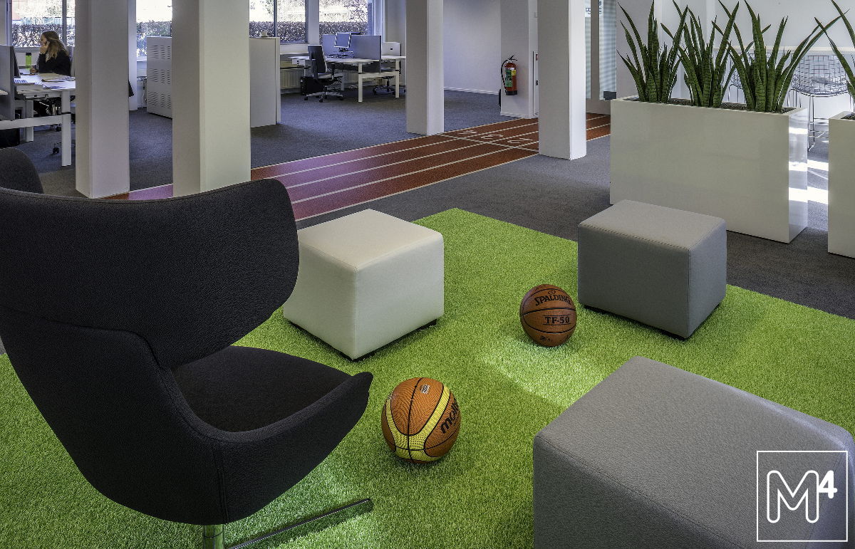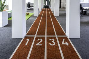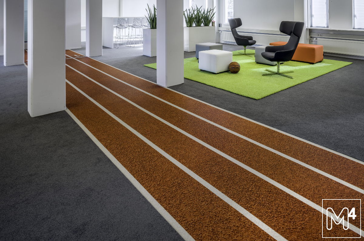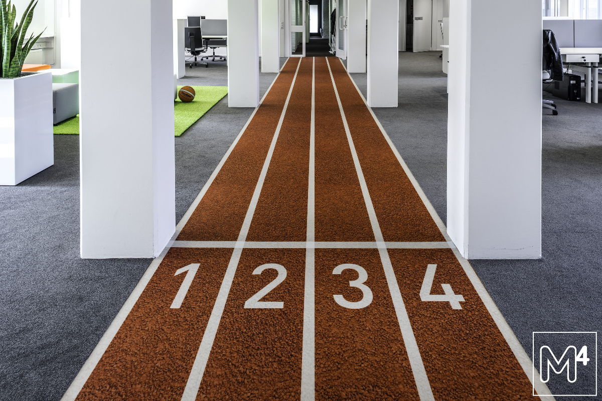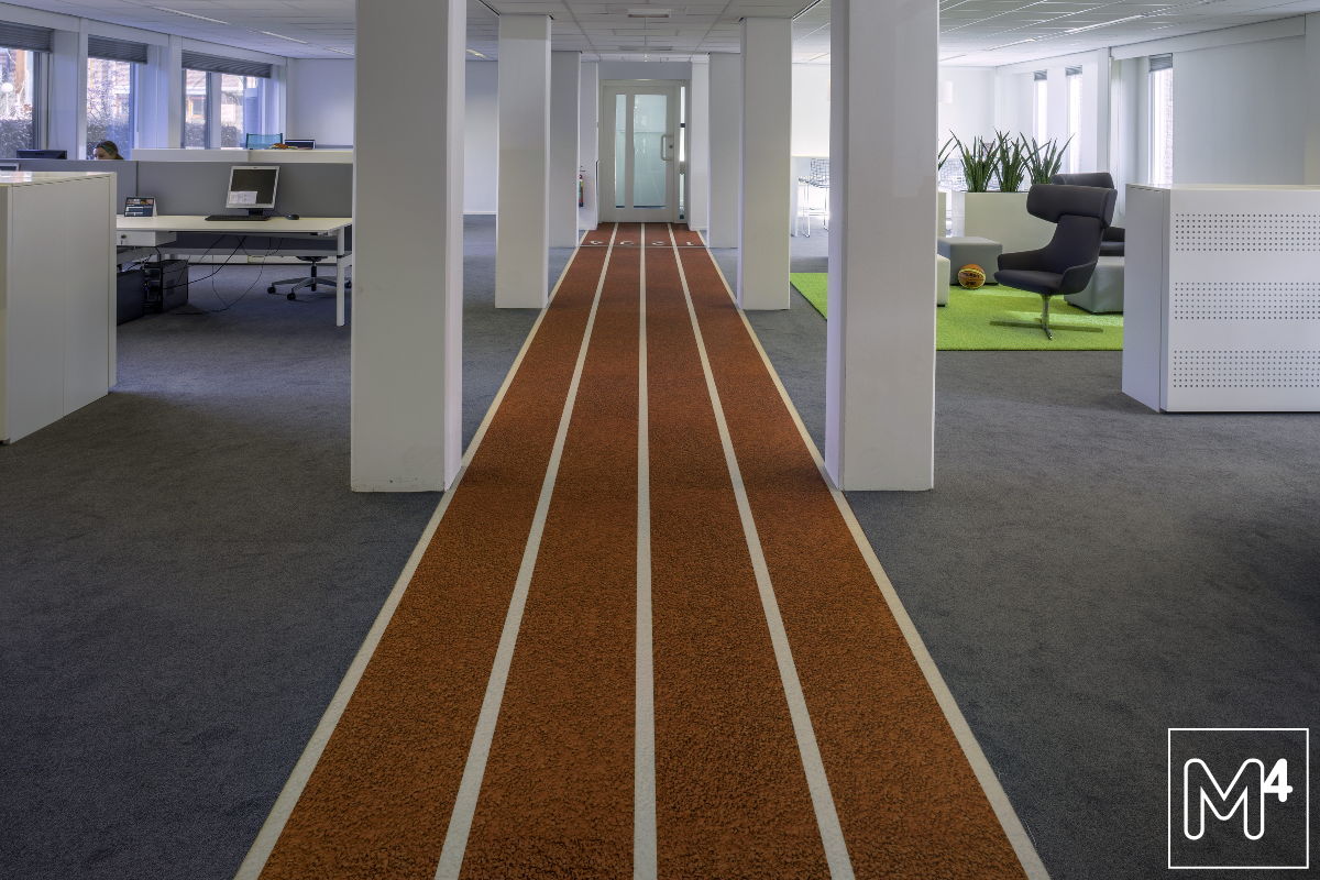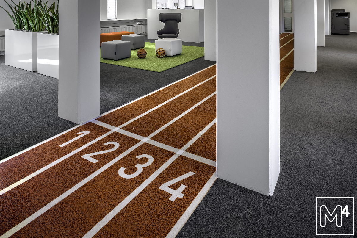 De vloer in het kantoor in Groningen is een echte sportvloer geworden. Een sprinttrack met baanaanduiding geprint op hoogwaardig vinyl. De missie om een sportieve, gezonde werkomgeving te creeren was 1 van de uitgangspunten bij dit ontwerp.