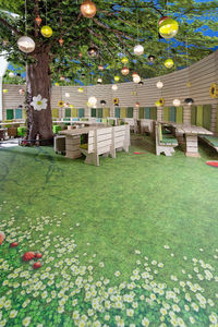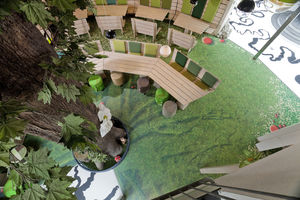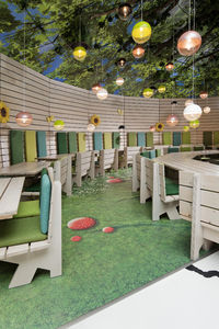 De vloer in Villa Pardoes bestaat uit een haarscherp ontwerp van gras met bloemetjes en zelfs hier en daar een paddestoel. De picknickplaats is binnen, maar door het prachtige vloerontwerp lijkt het net alsof je buiten aan het picknicken bent.